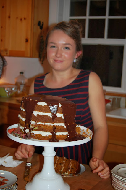To top off the meal, Grace had made a 4 layer pumpkin cake with layers of cream cheese in between and a chocolate ganache on top. It was decadent {or so I was told.} She also made gluten free pumpkin cupcakes with a delicious cream cheese frosting, which Hannah and I thoroughly enjoyed...cheating with the frosting, but hey, it's my daughter's bridal shower!
